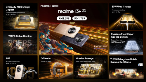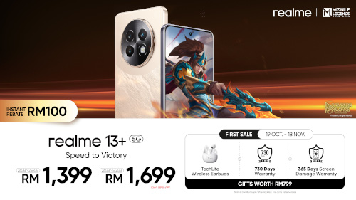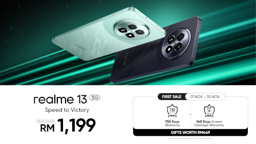 The series features two models: the realme 13+ 5G and the realme 13 5G. Starting at RM1,399, the realme 13+ 5G will be available from October 19, while the realme 13 5G launches on November 1, priced at RM1,199. Additionally, customers can purchase the realme 13+ 5G (12GB+512GB) version for RM1,699 during the promotional period from October 19 to November 18. Shoppers will also enjoy complimentary gifts worth up to RM799, including Techlife Wireless Earbuds, a 365-day Screen Damage Warranty, and a 730-day Warranty.