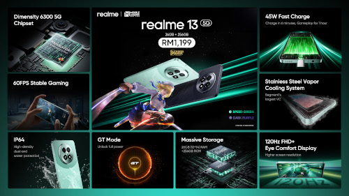 The realme 13 Series 5G will be available through telco partners CelcomDigi, Maxis, and U Mobile, as well as retail outlets like DirectD and Urban Republic.