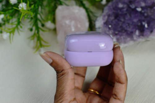 The top half features a high-shine, glossy finish. It gives the case a vibrant, polished look, allowing colours — especially Lavender and Greige — to stand out beautifully. The reflective surface adds a subtle “tech-jewellery” feel that complements the clip-on design of the earbuds themselves.